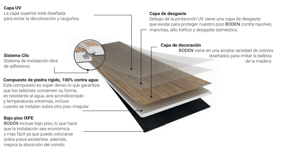 Con un largo de 1.80 metros, los pisos BODEN ofrecen la combinación perfecta de estilo y durabilidad, asegurando que su hogar o negocio tenga un aspecto impecable durante muchos años. Los pisos BODEN cuentan con las mejores propiedades del mercado, incluyendo una gran resistencia a la humedad, rayones y manchas, lo que los hace ideales para áreas de alto tráfico. Además, su fácil instalación y mantenimiento los convierte en una opción práctica y económica para cualquier proyecto de renovación.